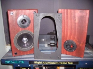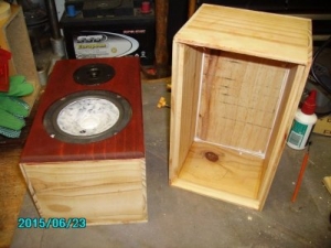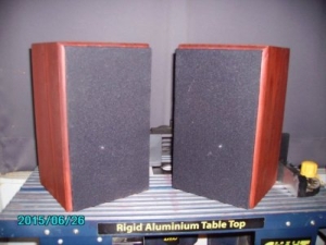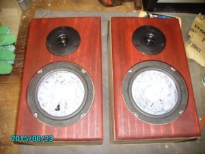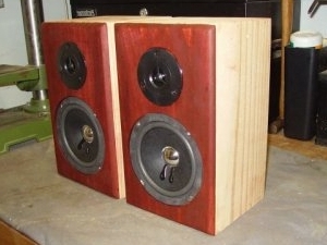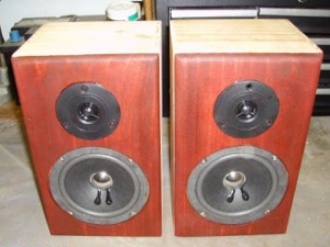 The bass drivers had the cones doped with PVA to prevent cone breakup, I am not concerned about the two sections having different impedences, as any decent modern amp should have no problem handling this. The crossover used is simply a 4.7uF capacitor connected to the inphase tweeter as a 6dB/octave Butterworth filter, which seems to work well. I stained the cabinets a rich red and used a decent set of speaker connector terminals on the rear panel.