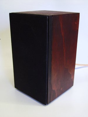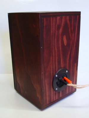 Both drivers had the cones doped with PVA to prevent cone breakup, with the 2nd order Linkwitz Crossover contributing to the clean sound. I am not concerned about the two sections having different impedences, as any decent modern amp should have no problem handling this; the Workshop amplifier is a 30 year old Sansui AU-217. Crossover assembly was on a Jaycar CX-2605 Crossover PCB, using Jaycar off the shelf inductors and polypropylene capacitors. I stained the cabinet to great effect and used a decent set of speaker connector terminals on the rear panel.